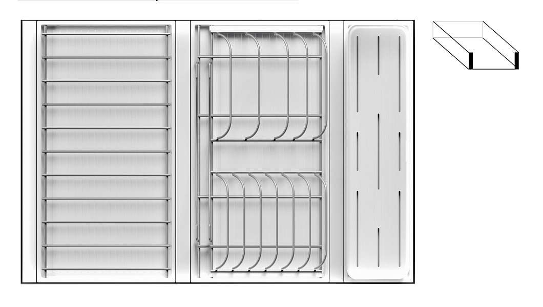 1 для столовых приборов (состоит из: 1 х емкость пластиковая 400 х 100 х 120 мм, 1 х поддон пластиковый 423 х 124 мм)